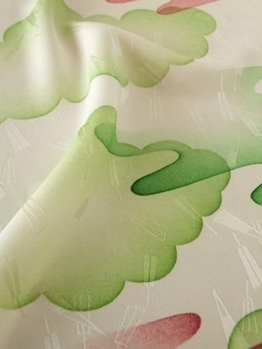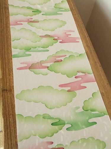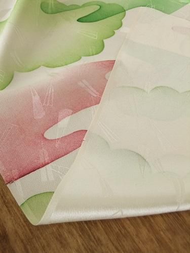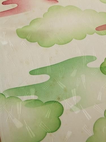 グリーンの雲に赤い霞文、扇の地模様が散りばめられて、ほんのり光沢が華やかです。しっとりしなやかで、するんするんと落ち感のある風合い。ストールなどにも。薄じみあり。襦袢地。