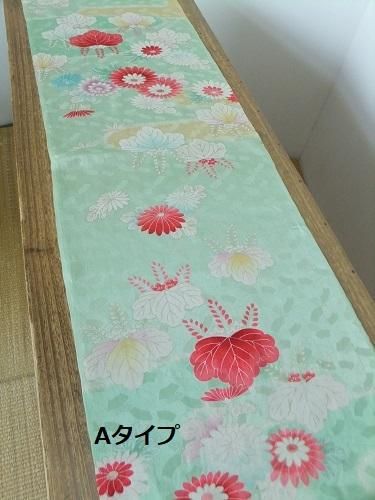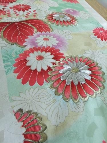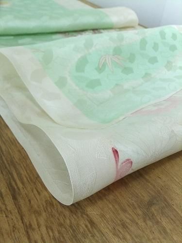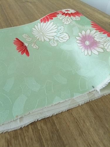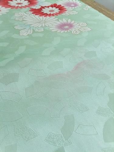 淡いグリーンに華やかな花模様。赤が効果的です♪扇の地模様が散りばめられてツヤやかです。柄6種。飾ったり、掛けたり、ディスプレイにも。折り山跡あり、薄い汚れあり。