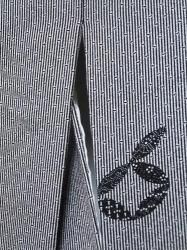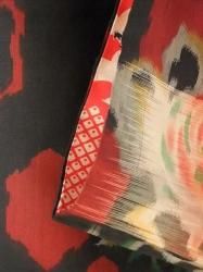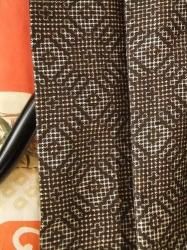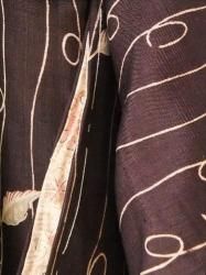濃紺風のすみ黒地。淡い黒に、ブルーの折り鶴文が散りばめられて。ほんのりシャリ感があり、さらっとした軽い風合いです。薄手で少し透け感も。内紐2ヶ所付き、右側の長い紐を中でくるっと一巻きして結ぶ形です。