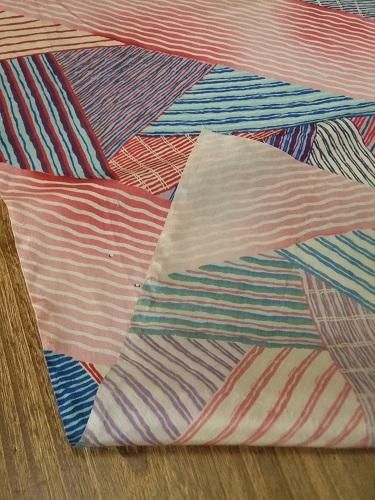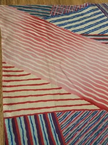 縞々のカラフルなパッチワーク風。どこか懐かしく、大胆な柄行きです♪薄手で軽やか、すべすべとした手触り。裏地に、ディスプレイに・・。スジ跡あり、薄い汚れあり。羽織の裏地。