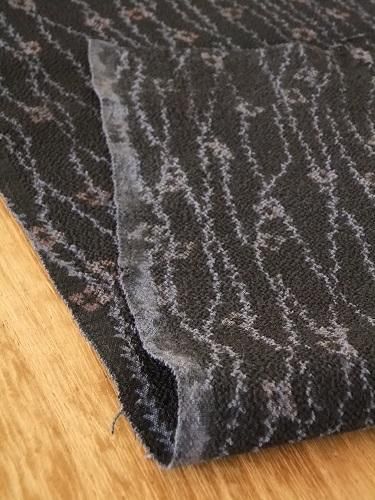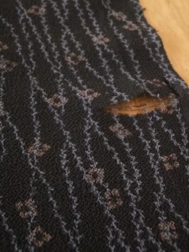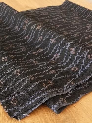 ギザギザの枝に、小さな花はほんのりピンク。しっとりと深い色味は、濃紺のような、黒のような・・。しっかりとしたシボのちりめん地、少しざらつきがあります。横に伸縮性。穴あき、弱りあり。