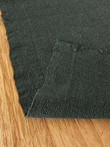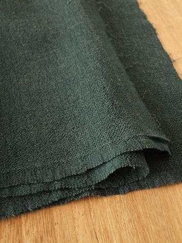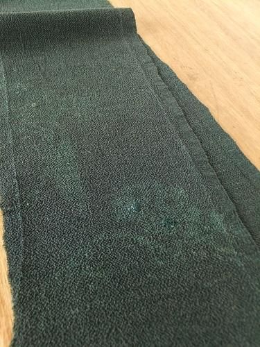 細かくしっかりとしたシボのちりめん地。深く暗みのグリーンです。横に伸縮性があり、軽やかでさらっと落ち感があります。スジ跡、色褪せあり。