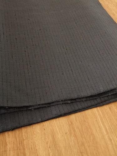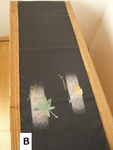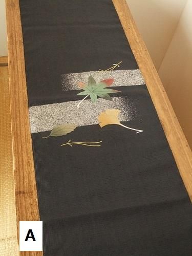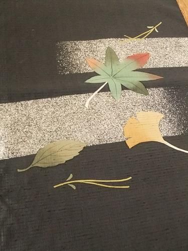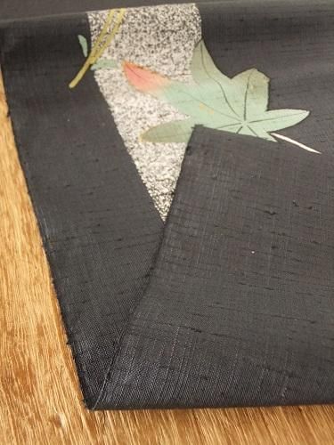 ほんのりシャリ感があり、軽やかでさらっとした風合い。しっとりと落ち着いた色味に、カエデとイチョウと松葉が描かれて・・。フシがアクセントのぜんまい紬。のれん風に壁掛けなどにも。
