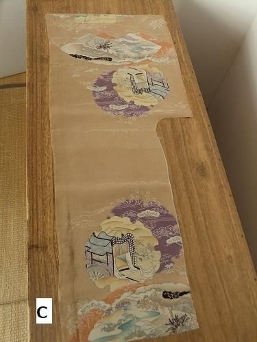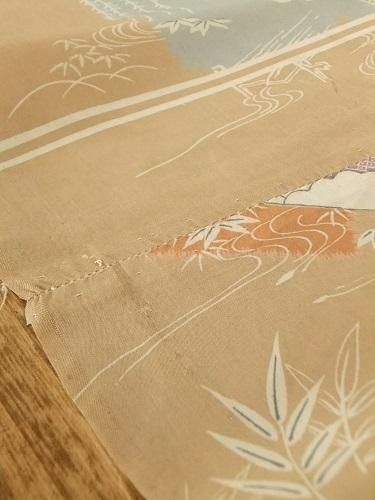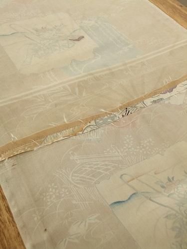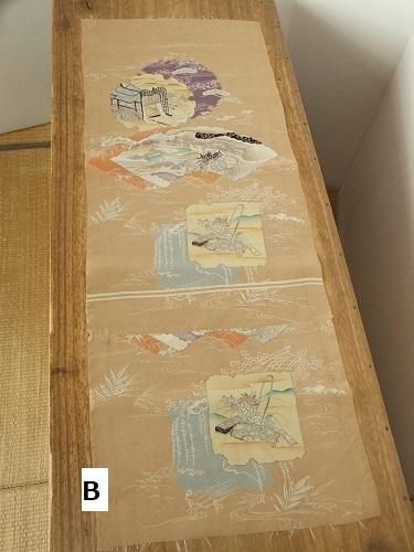 落ち感があり、すべすべツルっとした手触りです。ベージュの柔らかな色味に雪輪、扇、御所車文が優しく寄り添う柄行き。掛けたり、裏地に、一閑張りに。汚れ、継ぎあり。