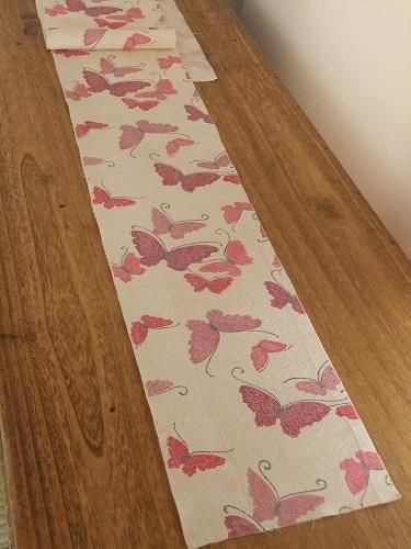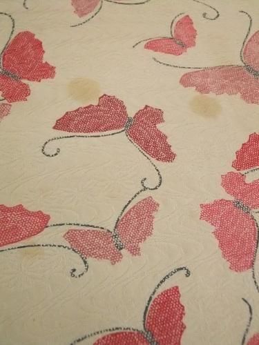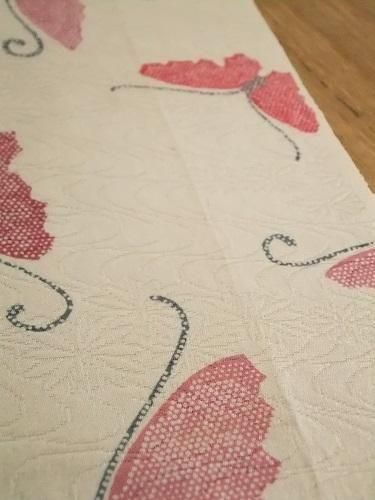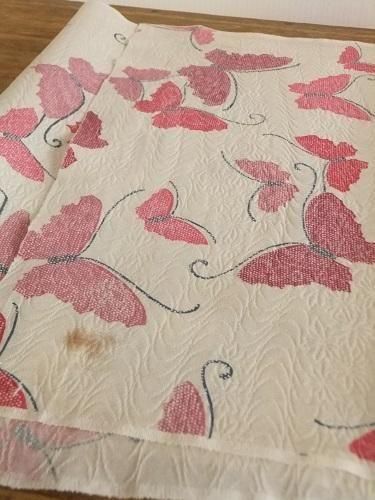 少し厚手、さらっとしていて地模様がちょっとぼこっとした肌触り。赤ムラサキ、赤ピンク、花びらのように舞う蝶々・・どこかレトロな雰囲気です ♪ ディスプレイにも。汚れあり。