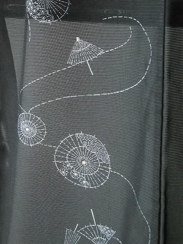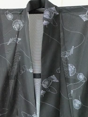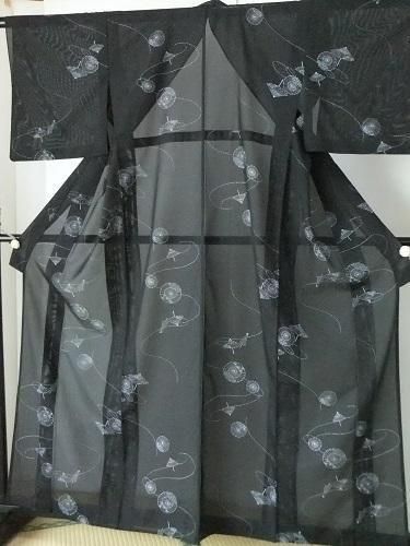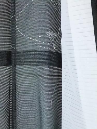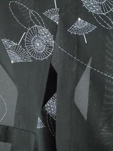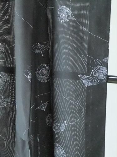 ハリがあり、シャリッとつるっとした風合い。すっきりとした黒に、ゆらりと白いカサがさり気なく・・♪ 隙間の開いた涼やかな生地です。透け感も魅力。リメイクにも・・。衿折り山に汚れあり。夏物・化繊絽。
