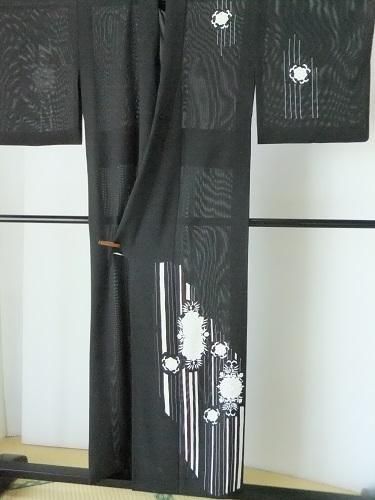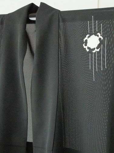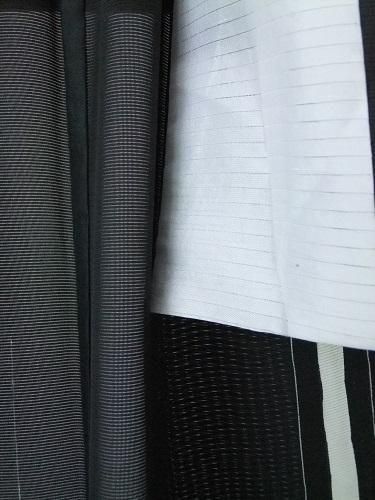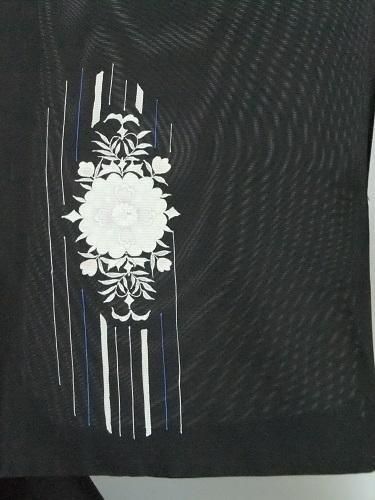 さらりとしなやかで程よいハリがあります。黒地に白の華と縞、インパクト絶大です・・♪ 細かな隙間の開いた生地、透け感が涼やかです。リメイクにも・・。衿折り山他、汚れあり。夏物・絽。(どこかアンティークな香りも・・)