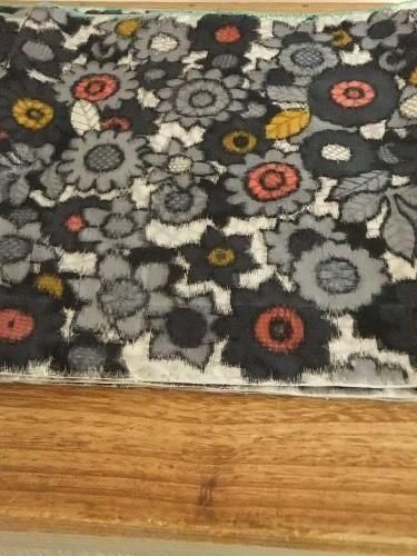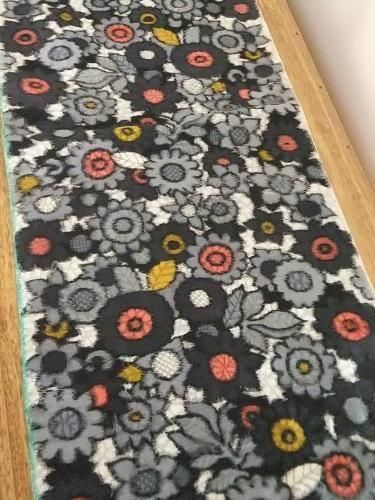 つるっとしていて、ちょっとシャリ感、ハリのある風合いです。ぎゅっと詰まった花模様、黄色とサーモンピンクがアクセント。折り山跡、小ジワ、穴あき(小)あり。