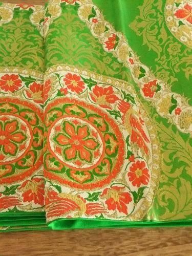 刺繍の部分はしっかりと、裏地はちょっとつるっとした風合い、少し厚手です。ゴールドがツヤやかに、鮮やかなグリーンとの組み合わせが気持ち良く、鳳凰がチラリと覗きます・・♪掛け物、敷物、リメイクにも。擦れた跡、ほつれ、細かなシワあり。2枚の布を重ねた袋状の形。どこかレトロな雰囲気も・・。