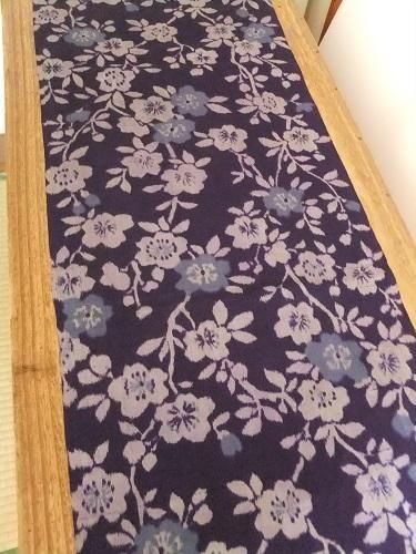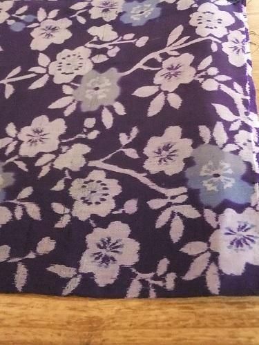 つるっとしていてシャリ感があります。華やぐ花模様が散りばめられて・・。深いなかに鮮やかさもある紫色。ヒラリとディスプレイにも。汚れ、色褪せあり。