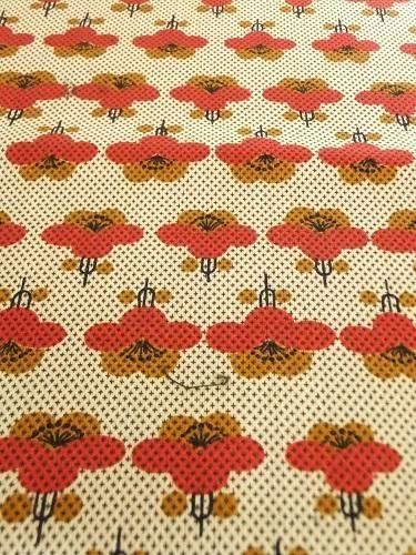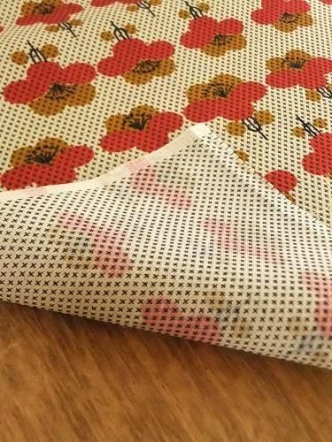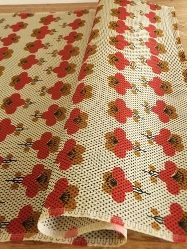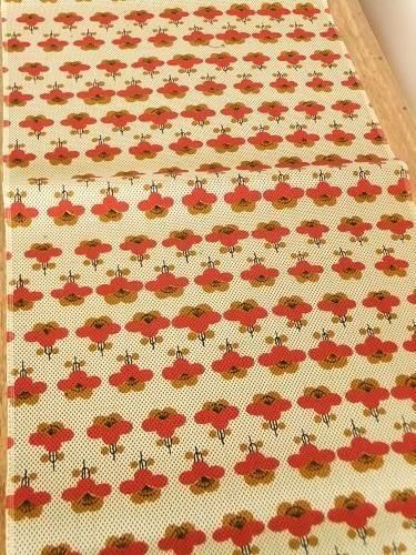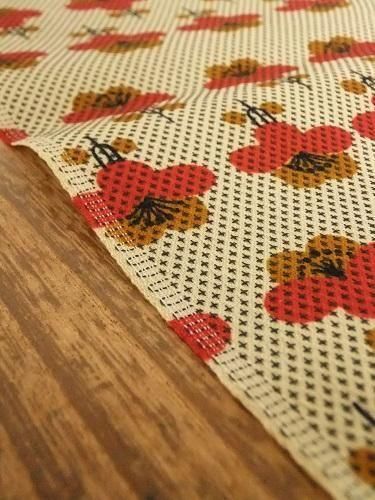 さらりとした手触り、少しハリがあり、柔らかさとしなやかさも。咲いた咲いた赤茶、黄色茶、並んだ花柄がどこかレトロ・・♪ 掛けたり、ディスプレイにも。小さな穴あき、弱りあり。