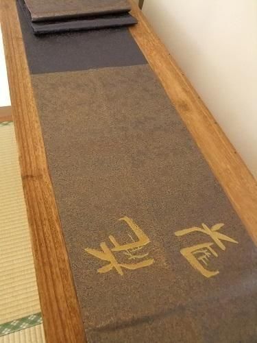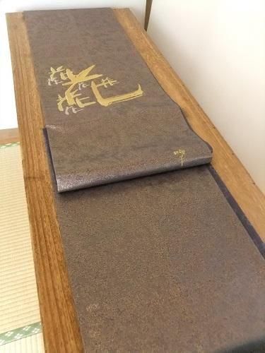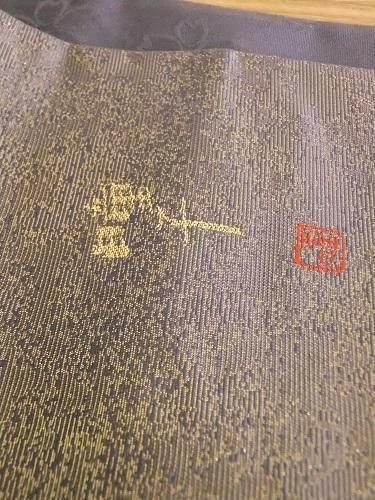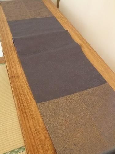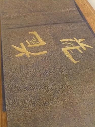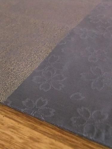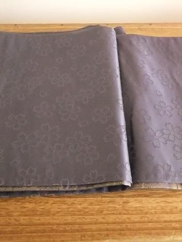 ラメが、しっとりとツヤを放ちます・・♪ 花、花、花、力強く、さり気なく描かれた文字。テーブルに、タンスに、足元に、リメイクにも。しなやかさ、ちょっと柔らかさのある風合い。2枚の布を重ねた袋状の形です。袋帯。折りジワあり。裏側のグレーの桜もお好みで・・。