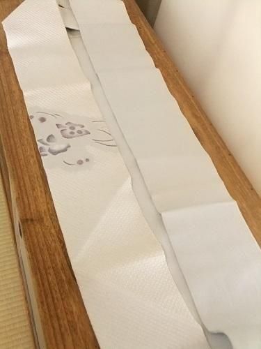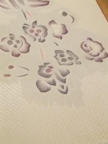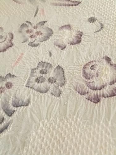 光沢のある白、シルバーを思わせるような・・・ポコポコと、ふっくらとした絞り。静けさと、華やかさとをまとって♪ リメイクにも。全体に汚れあり(薄茶色)手先から胴部分まで半分に折った形。名古屋帯。
