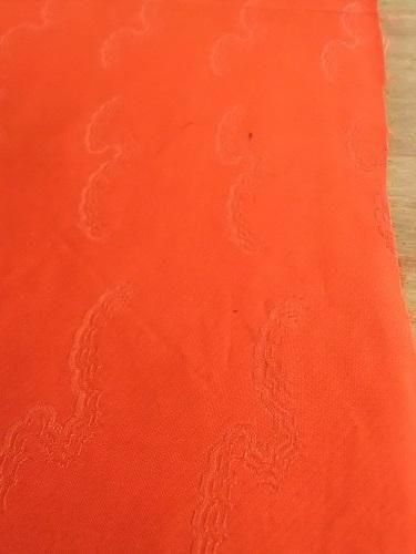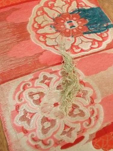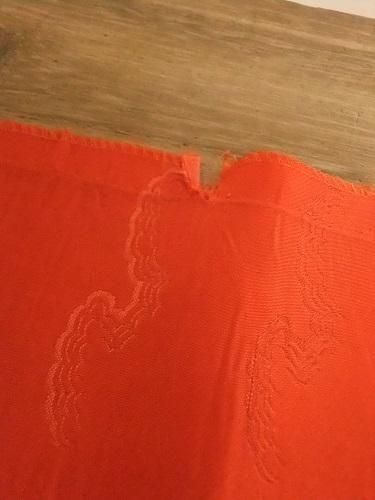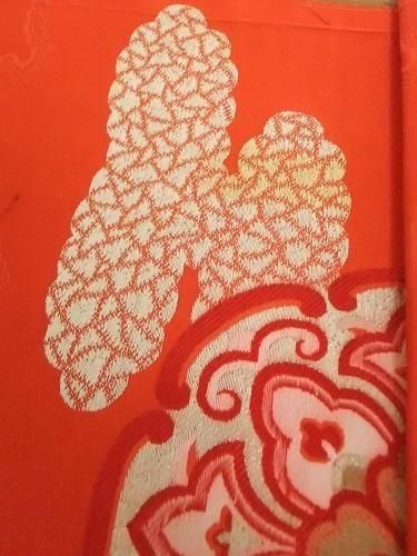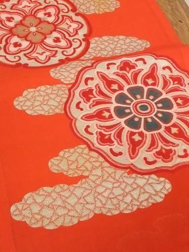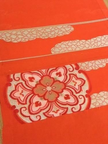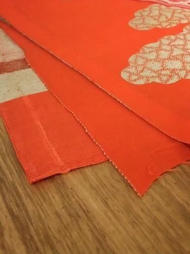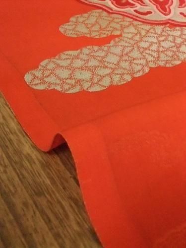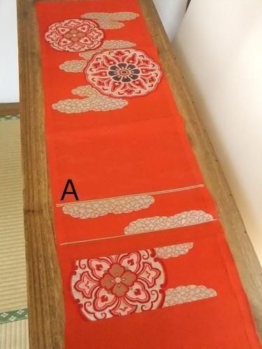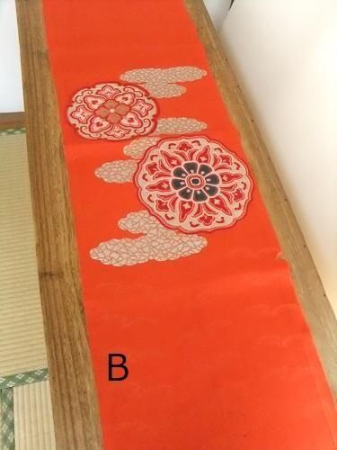 大きな花の丸の大きな存在感。鮮やかなオレンジにシルバーがキラキラと、目に眩しいです・・♪ 少し厚手で、つるっとした風合い。敷いたり、掛けたり、袋物にも。両端、真ん中に折り山跡、汚れあり。Cは地模様無し・オレンジの無地。