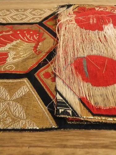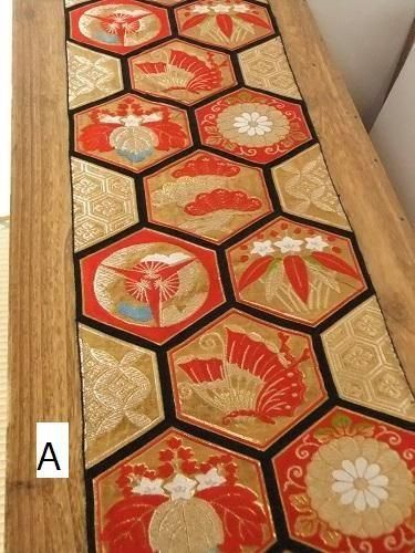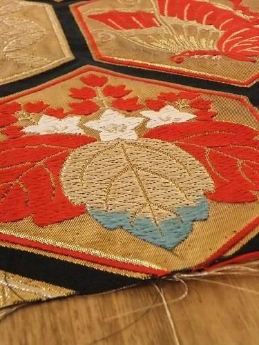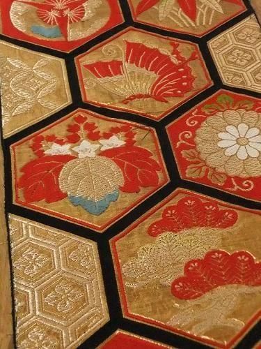 赤と金と黒とが織りなす六角形 ♪ 華やかで、愛らしく、大胆です・・。敷いたり、袋物などにも。ちょっとざらっと、程よいハリとしなやかさ。折り山跡あり、シワあり。