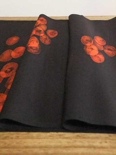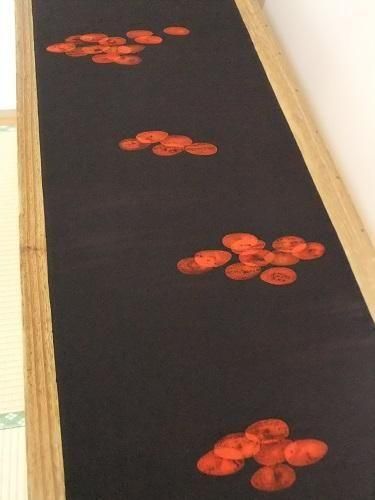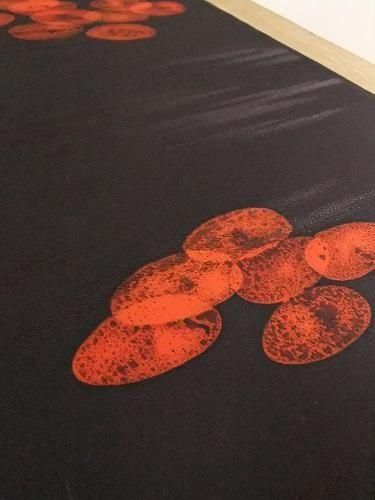 貝でしょうか、楕円の朱色が浮かび上がって。黒に近い、ちょっと紫を帯びたような焦げ茶。ゆらりと揺れる暖簾やカーテンにも・・。さらっと、するっと軽やかさのある風合い。