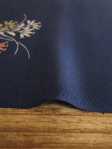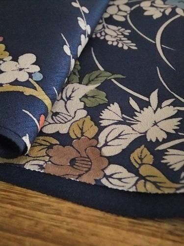 ほんのりとツヤ、深みのある紺地に花尽くし、しっとりと華やかな雰囲気が漂います ♪ 少し厚手、さらっとするっと落ち感があり、しなやかな風合い。柄違い10種、無地あり。色褪せあり。