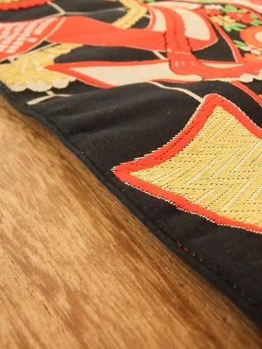黒地に赤と金と、大きな熨斗(のし・大きさ40cm程)。華やかな色味、インパクトがあります ♪厚手でしっかりとした風合い。 飾りに、リメイクにも・・。薄い汚れあり。女の子用帯。
