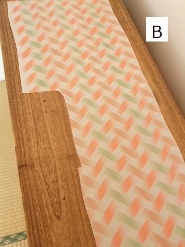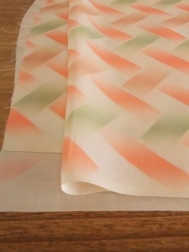 サーモンピンク、グリーン、パッと明るい色味が魅力です。薄手で、つるっとした風合い。掛けたり、裏地にも。汚れあり。羽織の裏地。