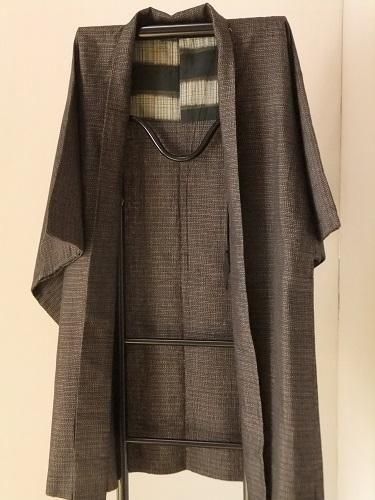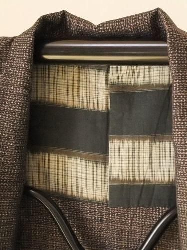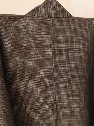 さらっと、少しザックリとしています。軽やかで温かみのある佇まい・・♪ 普段の羽織り物に、リメイクにも。少し汚れ、弱り、糸の飛び出しあり。男物・羽織・焦げ茶。
