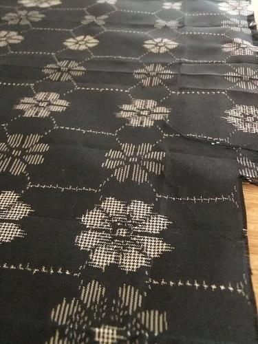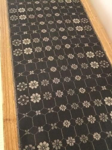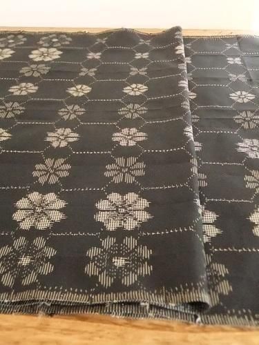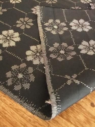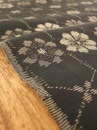さらっとつるっと、シャリ感のある風合いです。だんだん大きく、だんだん小さく、花模様。黒の落ち着いた感じと、花のキュートさとの出会い ♪ 袋物、羽織りものなどにも。折り山跡あり。