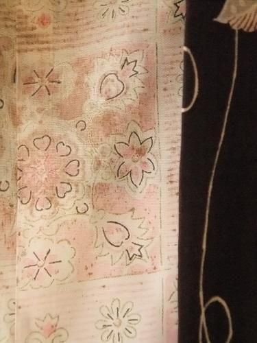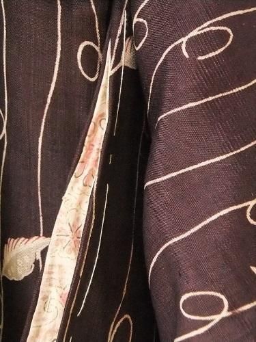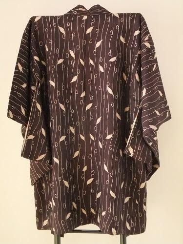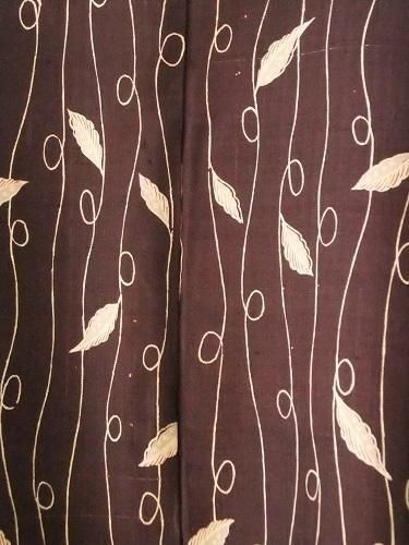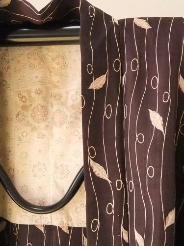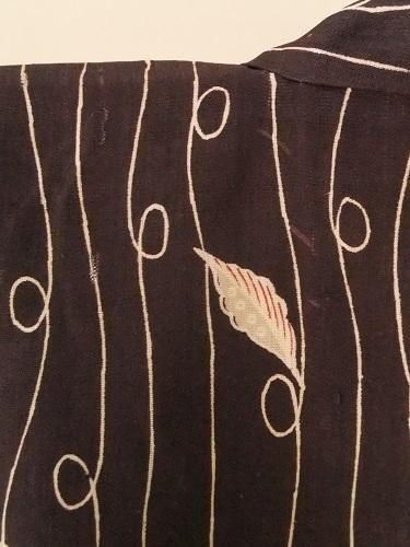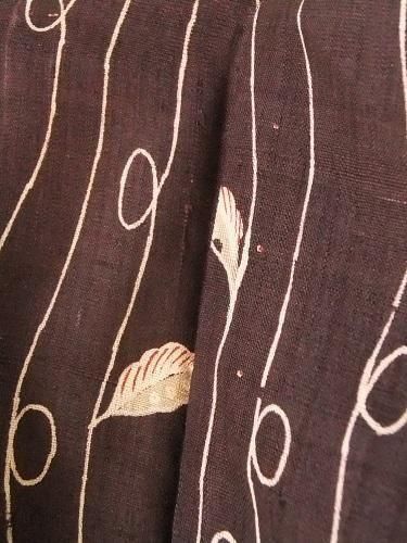 さらっと、ちょっとざらっと、軽やかでざっくりとした生地です。ヒラリと葉っぱ、くるりと蔓の丸が水玉のよう・・♪ 汚れ、弱りあり。リメイク、普段の羽織り物にも。
