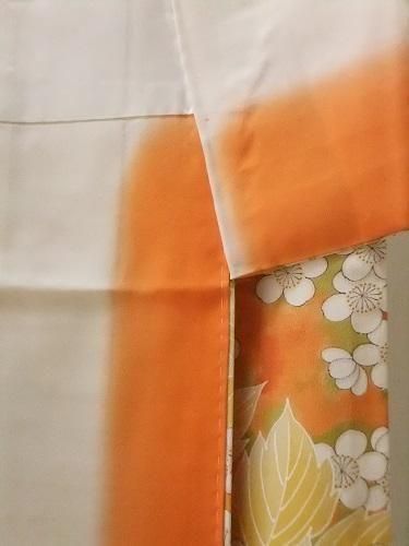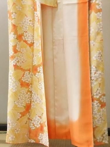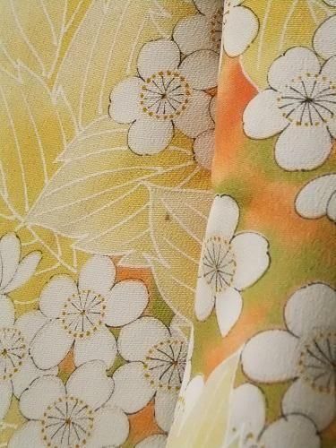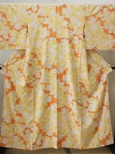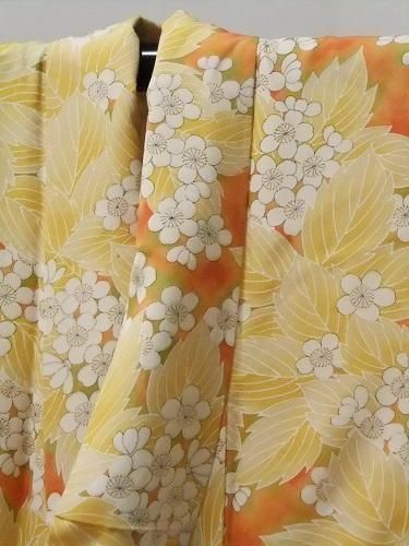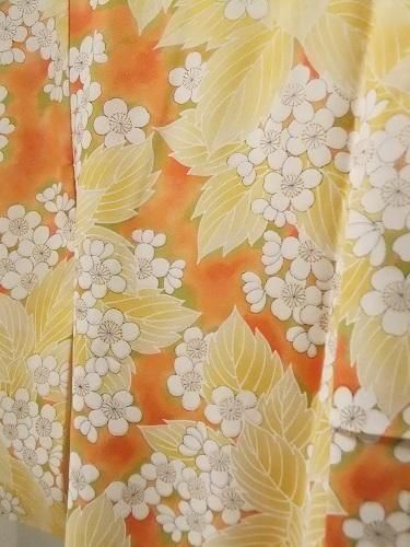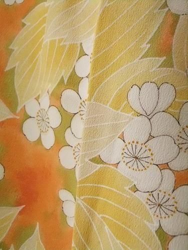 所々のオレンジが効いてます・・♪ 明るく、眩しく、華やぐ柄行き。さらさらっと、ちょっとするっと、落ち感のある風合い。リメイクにも。わずかに汚れ、裾にややたるみあり。