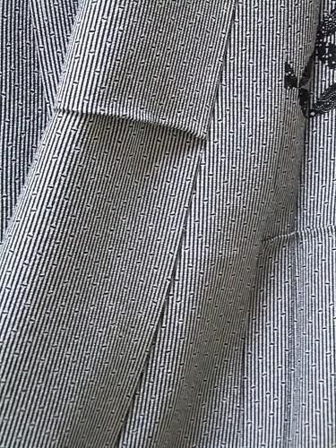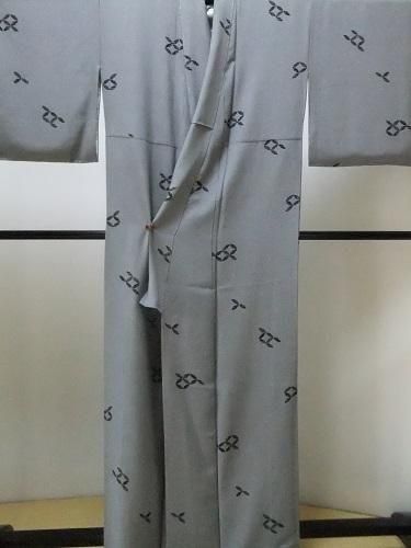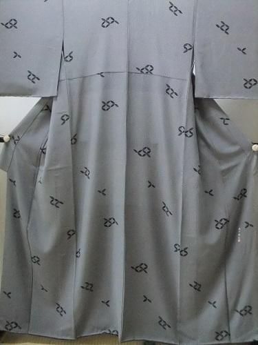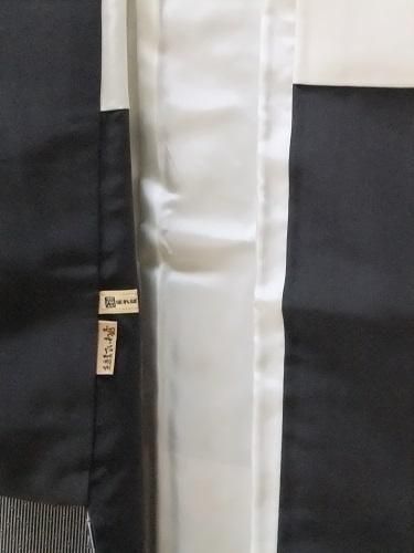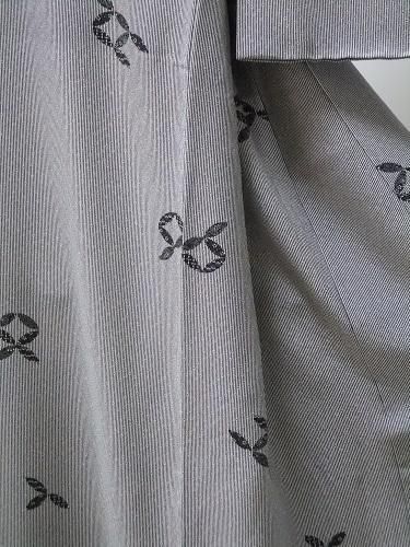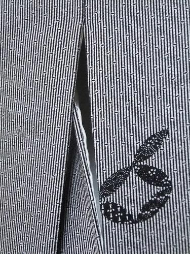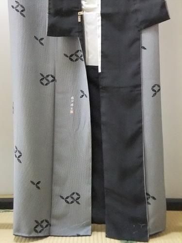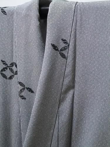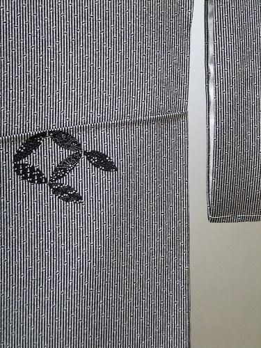 するっと落ち感のある風合い、少し重みがあります。チェーンのようにも見える洋風な柄行き。縞々は竹模様、凝った意匠が魅力です ♪ スミクロの裏がちらりと・・。わずかに汚れ、裾にややたるみあり。未使用品。