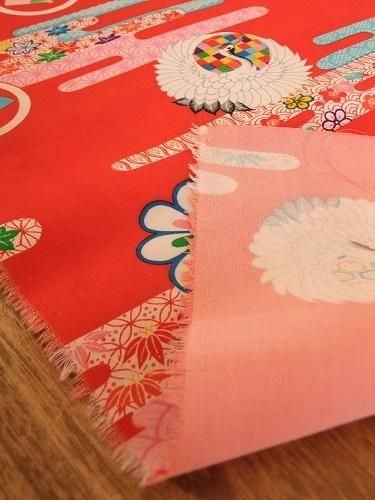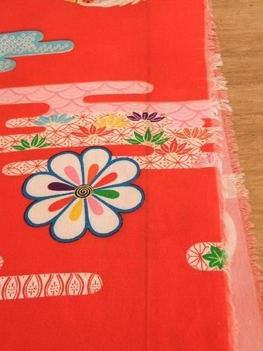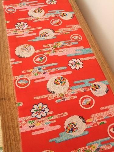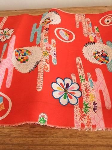 つるっと、ちょっとざらっと、落ち感のある風合いです。鮮やかな赤、ピンク、水色に白。カラフルで華やか、鶴の丸、花、霞文も・・。折り山跡汚れあり。