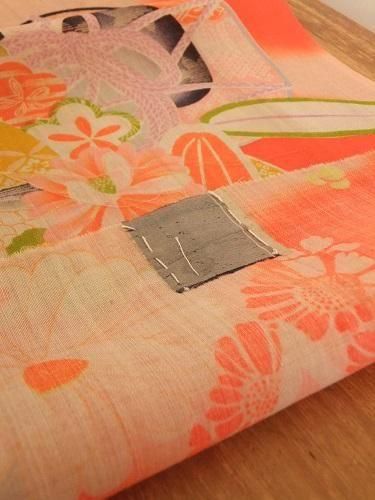サラッと軽やかで少しハリのある風合いです。鮮やかなオレンジ、ちょっと蛍光色。大きく広げた手のひらサイズの鼓と毬。穴あき、継ぎ当て、汚れあり。ウール。